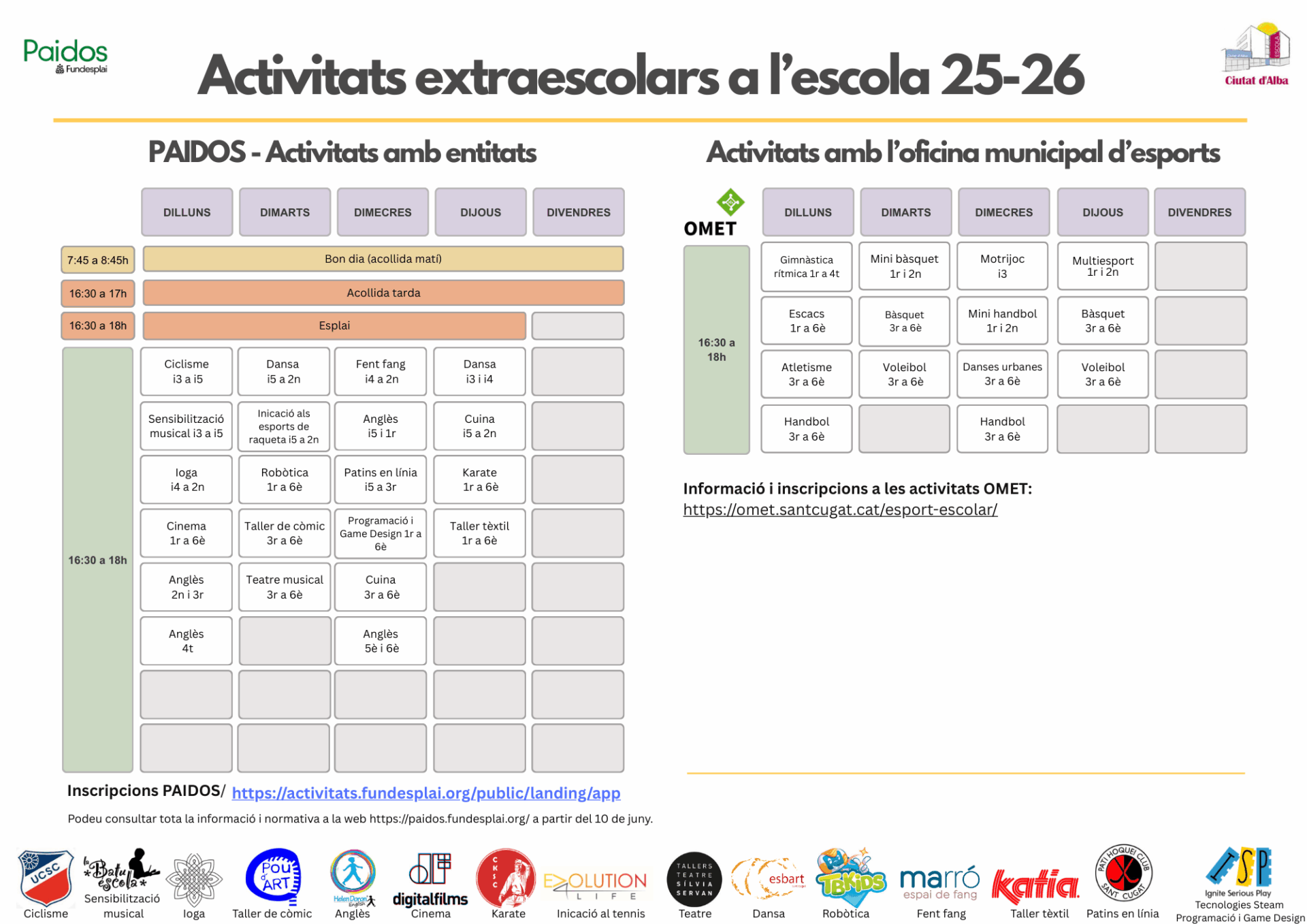 - La resta d’activitats extraescolars comencen a partir del dilluns 15 de setembre i finalitzaran l’últim dia de curs (excepte Natació, que començarà l’1 d’octubre [pendent de confirmació]).